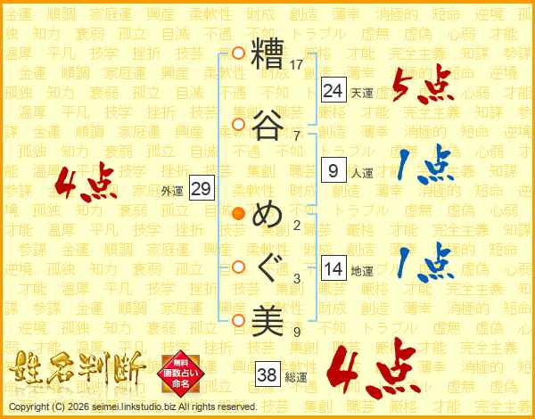 糟(17画)谷(7画) め(2画)ぐ(3画)美(9画)