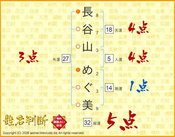 長(8画)谷(7画)山(3画) め(2画)ぐ(3画)美(9画)