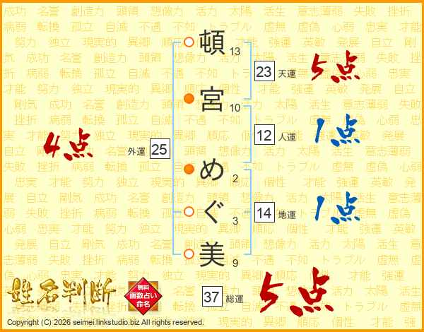 頓宮めぐ美さんの総運は37画の5点!