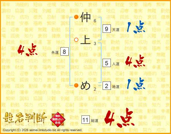 生活面を象徴する運勢です。外部から受ける影響力を表し、結婚運、家庭運や職場、環境への順応性を表します。総運から人運を引いた画数。姓や名が1文字の場合を除く。