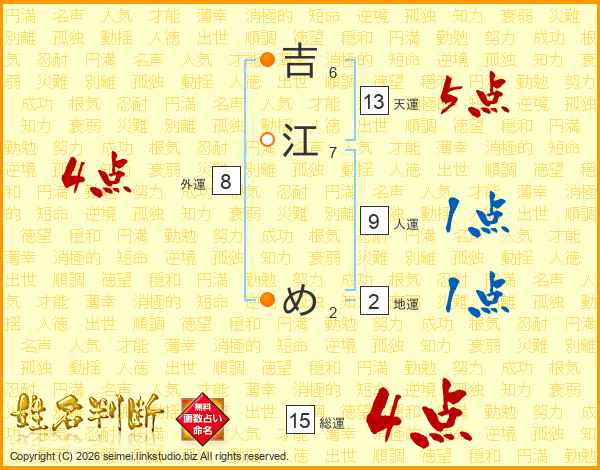 生活面を象徴する運勢です。外部から受ける影響力を表し、結婚運、家庭運や職場、環境への順応性を表します。総運から人運を引いた画数。姓や名が1文字の場合を除く。