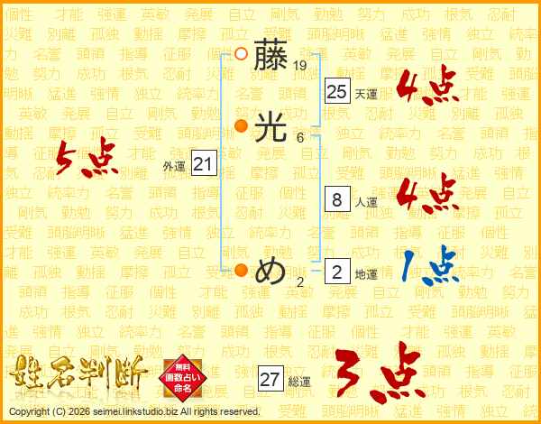家系が持つ宿命的な運勢を表します。祖先から受け継いだ苗字ですので自分の力が及びません。家柄を象徴します。苗字の合計画数。