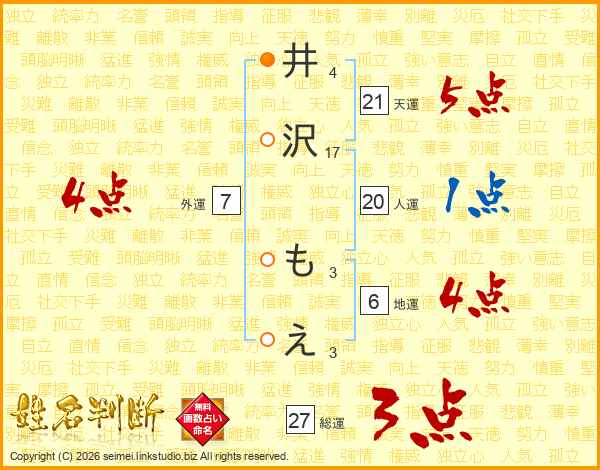 生活面を象徴する運勢です。外部から受ける影響力を表し、結婚運、家庭運や職場、環境への順応性を表します。総運から人運を引いた画数。姓や名が1文字の場合を除く。