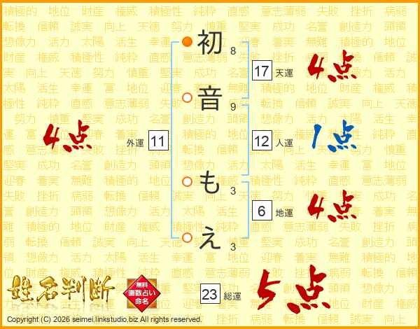 初音もえさんの総運は23画の5点!