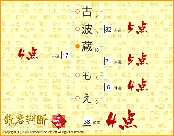 古(5画)波(9画)蔵(18画) も(3画)え(3画)
