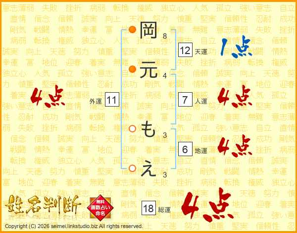 岡元もえさんの総運は18画の4点!