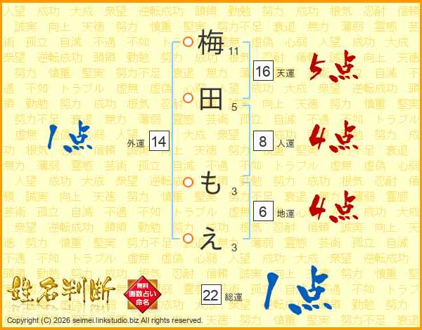 梅田もえさんの総運は22画の1点!