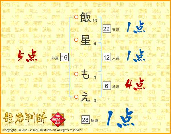 生活面を象徴する運勢です。外部から受ける影響力を表し、結婚運、家庭運や職場、環境への順応性を表します。総運から人運を引いた画数。姓や名が1文字の場合を除く。