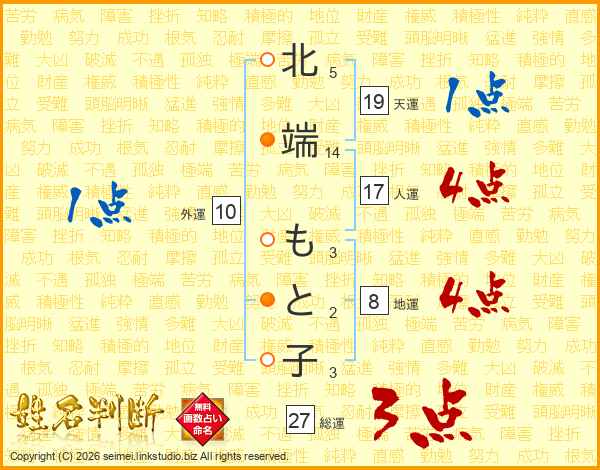 北(5画)端(14画) も(3画)と(2画)子(3画)