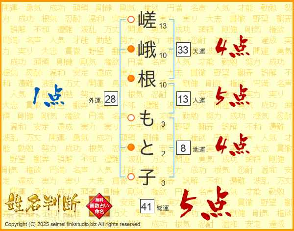 嵯(13画)峨(10画)根(10画) も(3画)と(2画)子(3画)