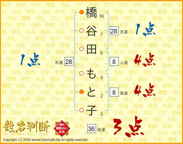 橋谷田もと子さんの総運は36画の3点!