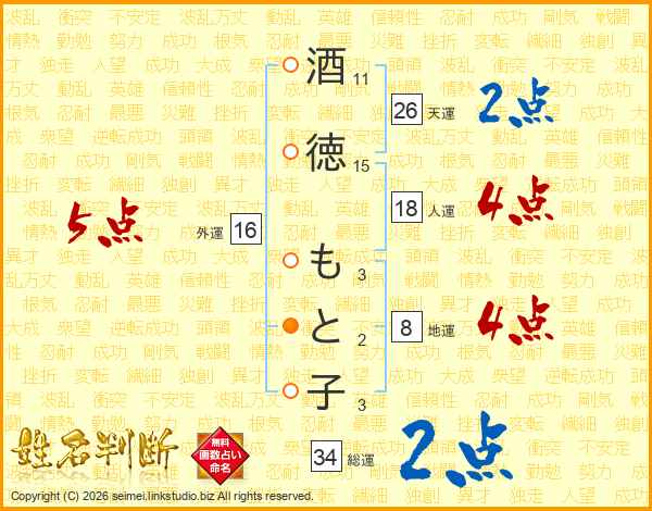 酒(11画)徳(15画) も(3画)と(2画)子(3画)