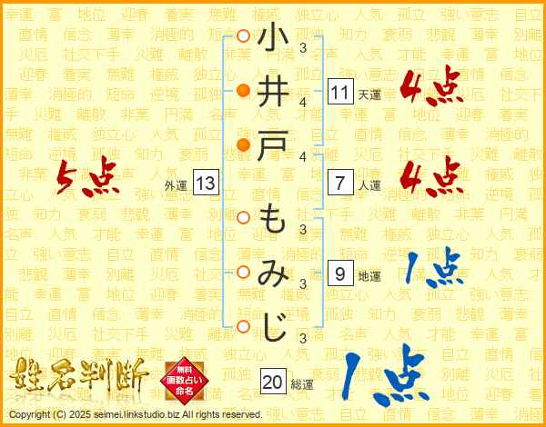 生活面を象徴する運勢です。外部から受ける影響力を表し、結婚運、家庭運や職場、環境への順応性を表します。総運から人運を引いた画数。姓や名が1文字の場合を除く。
