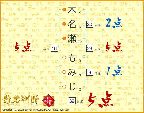 木(4画)名(6画)瀬(20画) も(3画)み(3画)じ(3画)