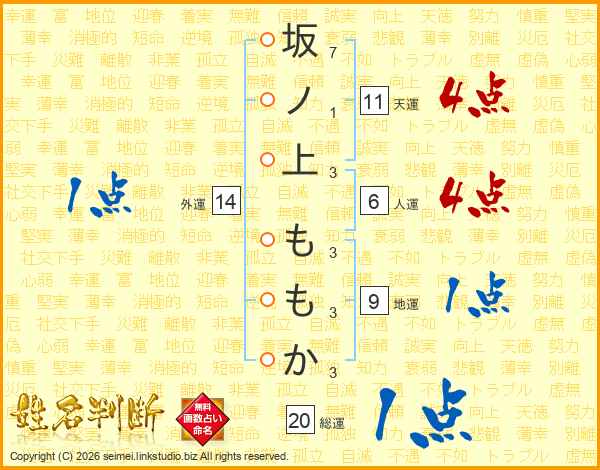 生活面を象徴する運勢です。外部から受ける影響力を表し、結婚運、家庭運や職場、環境への順応性を表します。総運から人運を引いた画数。姓や名が1文字の場合を除く。