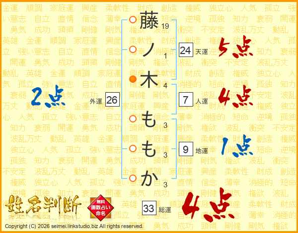 家系が持つ宿命的な運勢を表します。祖先から受け継いだ苗字ですので自分の力が及びません。家柄を象徴します。苗字の合計画数。