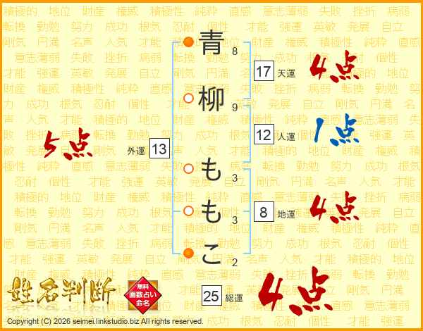 青(8画)柳(9画) も(3画)も(3画)こ(2画)