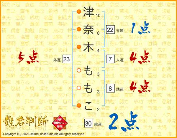 津(10画)奈(8画)木(4画) も(3画)も(3画)こ(2画)