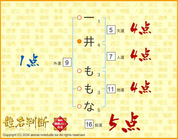 一(1画)井(4画) も(3画)も(3画)な(5画)