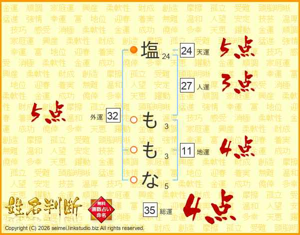 生活面を象徴する運勢です。外部から受ける影響力を表し、結婚運、家庭運や職場、環境への順応性を表します。総運から人運を引いた画数。姓や名が1文字の場合を除く。