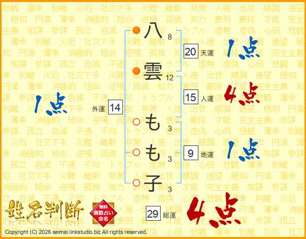八雲もも子さんの総運は29画の4点!
