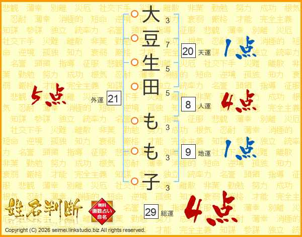 大(3画)豆(7画)生(5画)田(5画) も(3画)も(3画)子(3画)