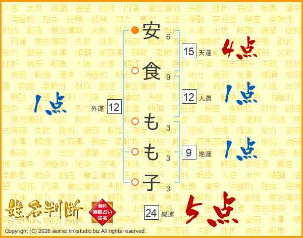 安(6画)食(9画) も(3画)も(3画)子(3画)