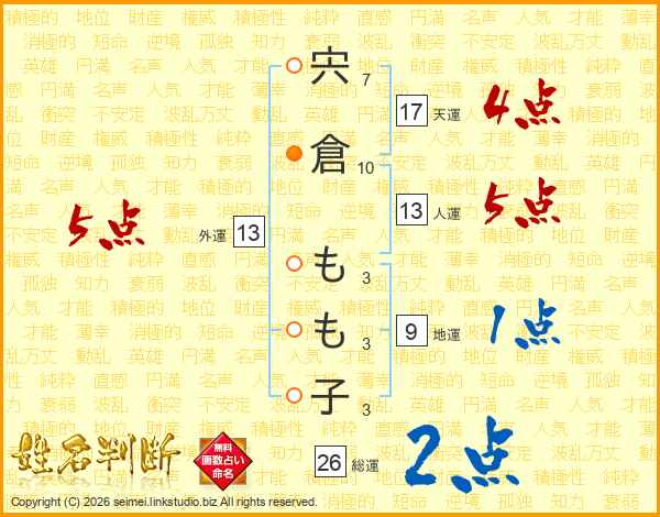 生活面を象徴する運勢です。外部から受ける影響力を表し、結婚運、家庭運や職場、環境への順応性を表します。総運から人運を引いた画数。姓や名が1文字の場合を除く。