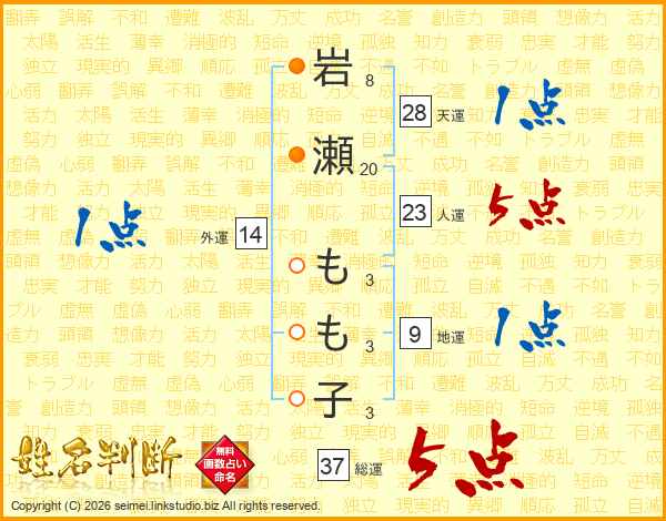 岩(8画)瀬(20画) も(3画)も(3画)子(3画)