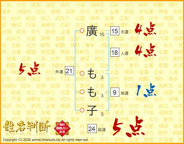 あなたの人生を表す1番重要な運勢です。生涯を通じて影響する総合運となり、主に50歳以降の晩年期に影響を及ぼします。苗字と名前の合計画数。