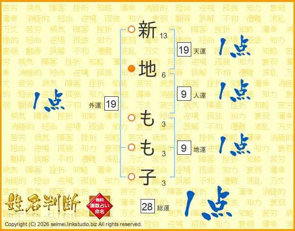 新(13画)地(6画) も(3画)も(3画)子(3画)