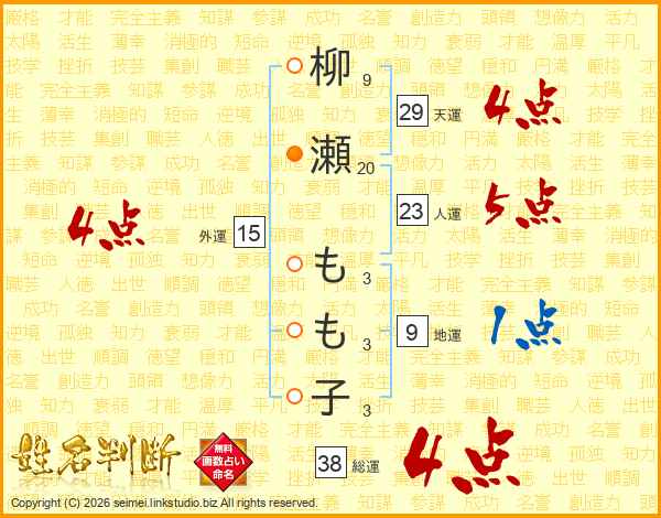 柳(9画)瀬(20画) も(3画)も(3画)子(3画)