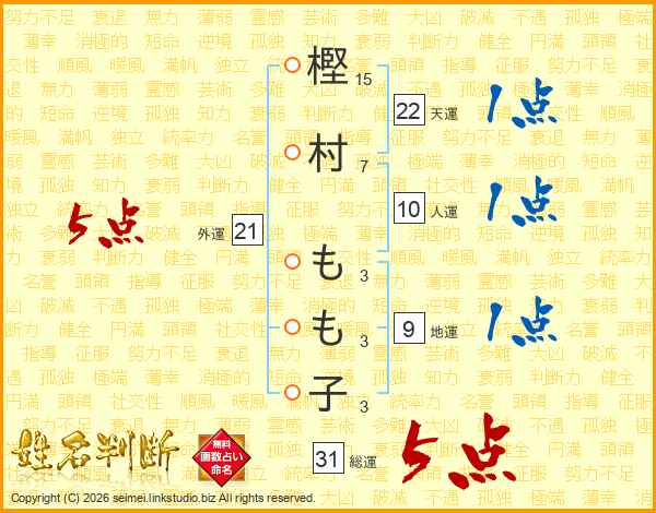 樫(15画)村(7画) も(3画)も(3画)子(3画)