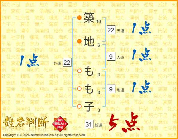 築(16画)地(6画) も(3画)も(3画)子(3画)