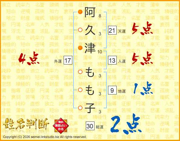 阿(8画)久(3画)津(10画) も(3画)も(3画)子(3画)