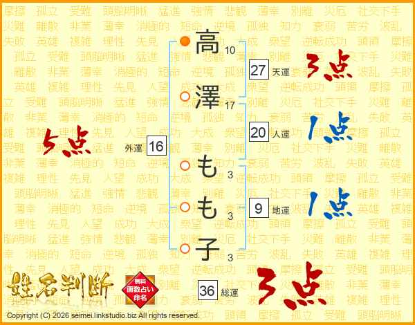 高(10画)澤(17画) も(3画)も(3画)子(3画)