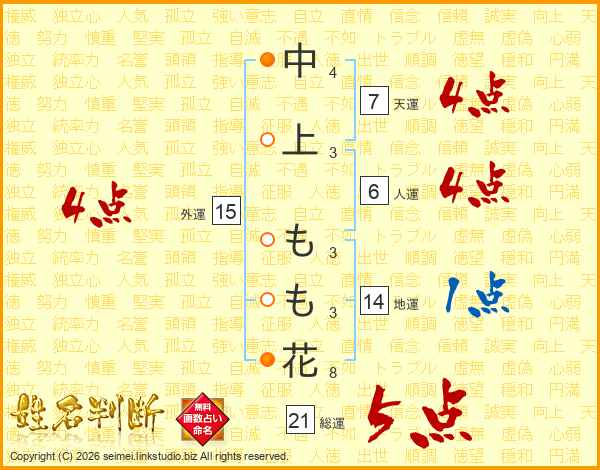 中(4画)上(3画) も(3画)も(3画)花(8画)