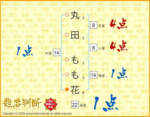 丸(3画)田(5画) も(3画)も(3画)花(8画)