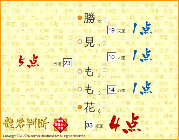 勝(12画)見(7画) も(3画)も(3画)花(8画)
