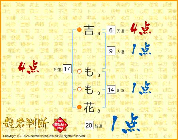 生活面を象徴する運勢です。外部から受ける影響力を表し、結婚運、家庭運や職場、環境への順応性を表します。総運から人運を引いた画数。姓や名が1文字の場合を除く。