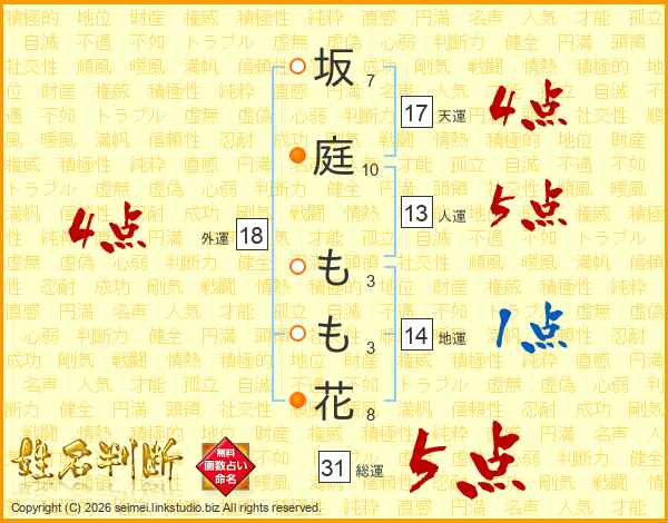 坂庭もも花さんの総運は31画の5点!
