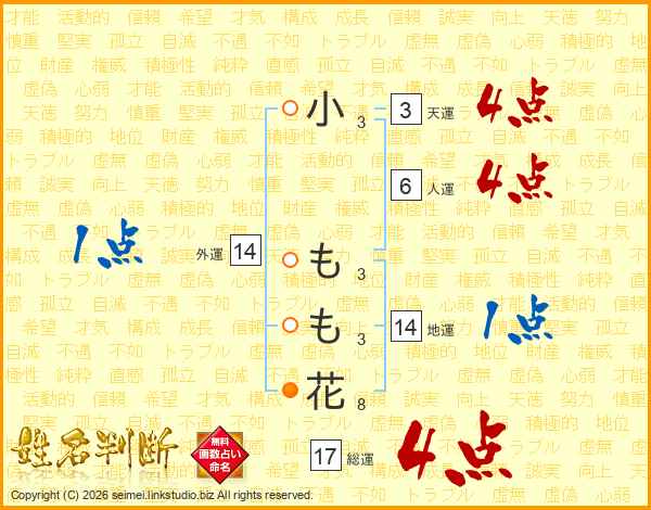 生活面を象徴する運勢です。外部から受ける影響力を表し、結婚運、家庭運や職場、環境への順応性を表します。総運から人運を引いた画数。姓や名が1文字の場合を除く。