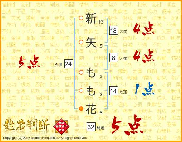 新(13画)矢(5画) も(3画)も(3画)花(8画)