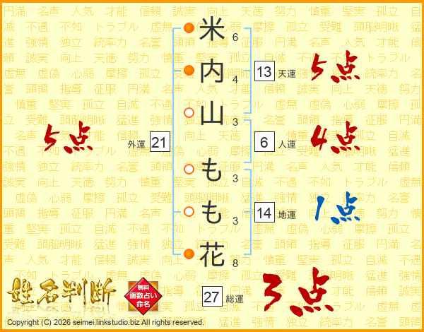 生活面を象徴する運勢です。外部から受ける影響力を表し、結婚運、家庭運や職場、環境への順応性を表します。総運から人運を引いた画数。姓や名が1文字の場合を除く。