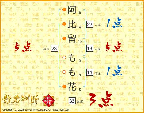 阿(8画)比(4画)留(10画) も(3画)も(3画)花(8画)