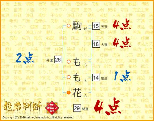 駒もも花さんの総運は29画の4点!
