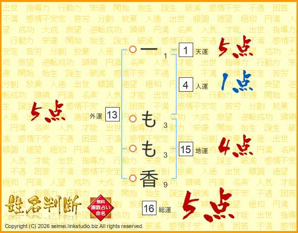 生活面を象徴する運勢です。外部から受ける影響力を表し、結婚運、家庭運や職場、環境への順応性を表します。総運から人運を引いた画数。姓や名が1文字の場合を除く。