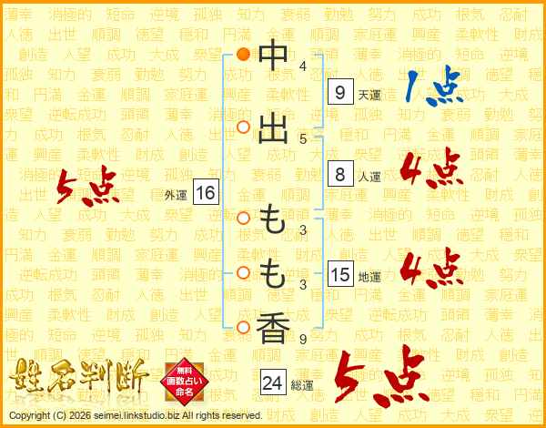 中(4画)出(5画) も(3画)も(3画)香(9画)