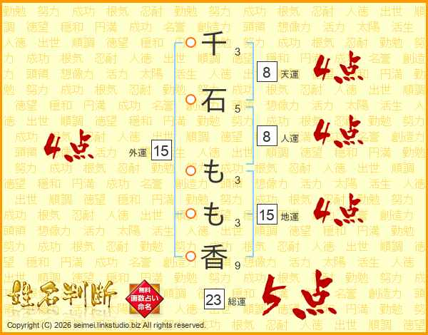 千(3画)石(5画) も(3画)も(3画)香(9画)