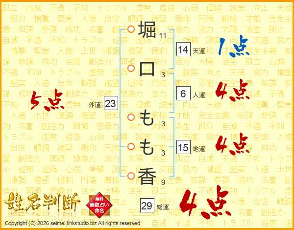 堀(11画)口(3画) も(3画)も(3画)香(9画)